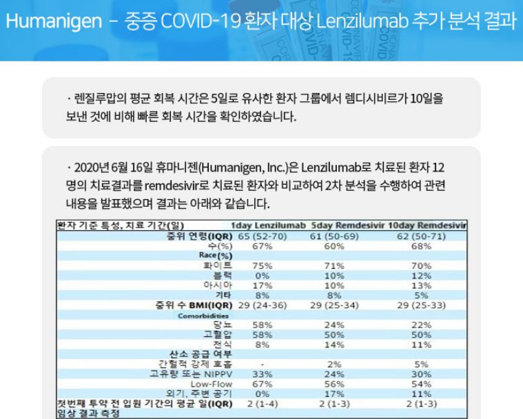 휴머니젠의 치료제 렌질루맙의 코로나19 중증환자 대상 평균 회복 시간이 렘데시비르에 비해 5일 빠르다는 추가 결과가 나온것을 자축하고 있다.