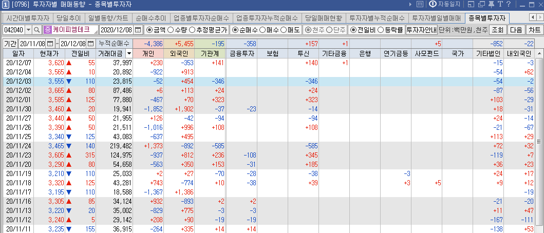 매출액 대비 시총이 거품이다. 그리고 주식수가 너무 많다. 금방 거래 정지를 당하더라도 전혀 이상할게 없다. 하지만 케이피엠테크는 회사차원에서 주가를 관리하기 때문에, 큰 걱정은 안해도 될 것이다.