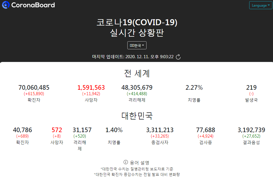 그리고 현재 시간 2020년 12월 11일 금요일, 21시경, 전세계 코로나 확진자가 7천만명을 돌파하였다.