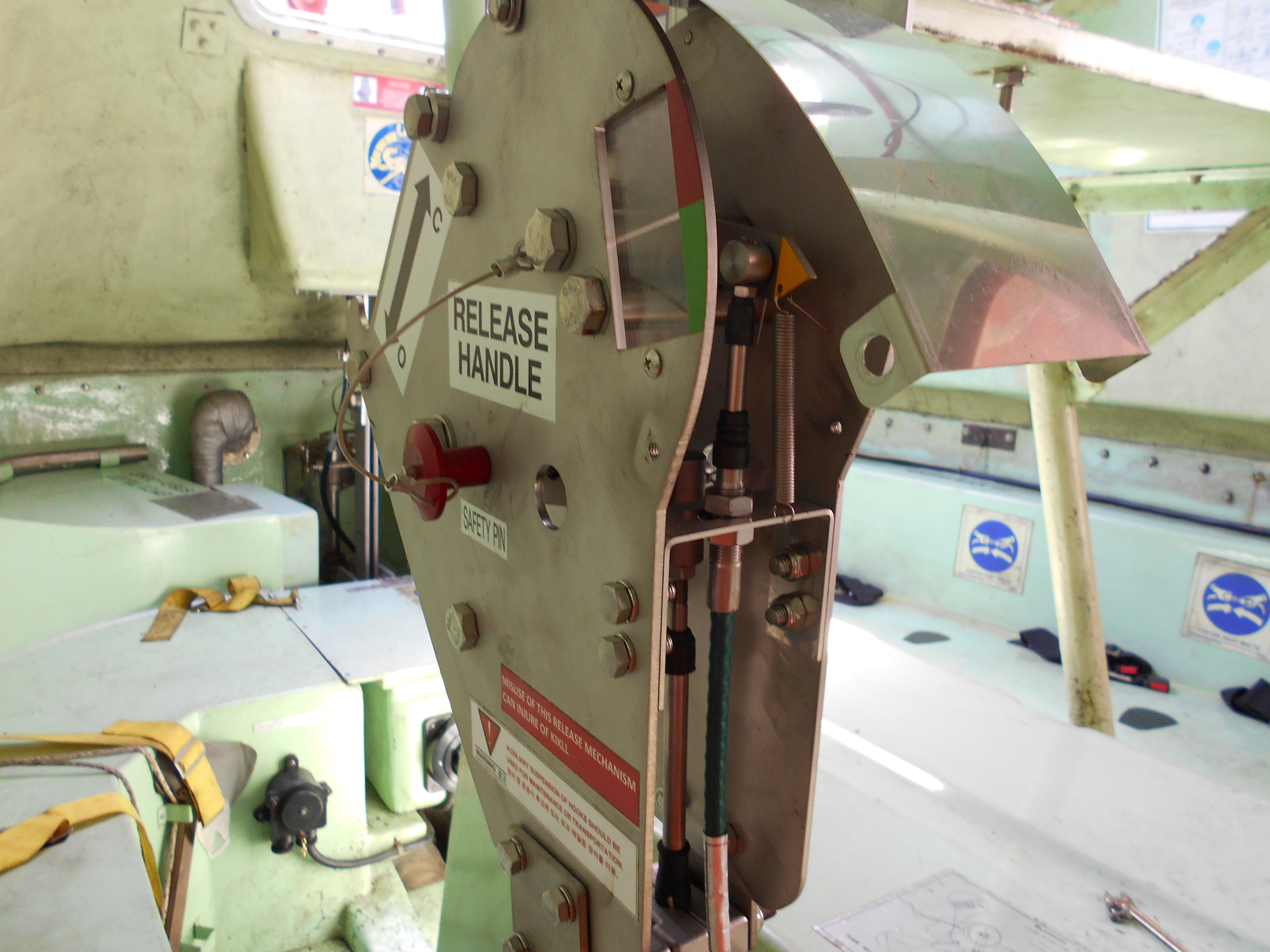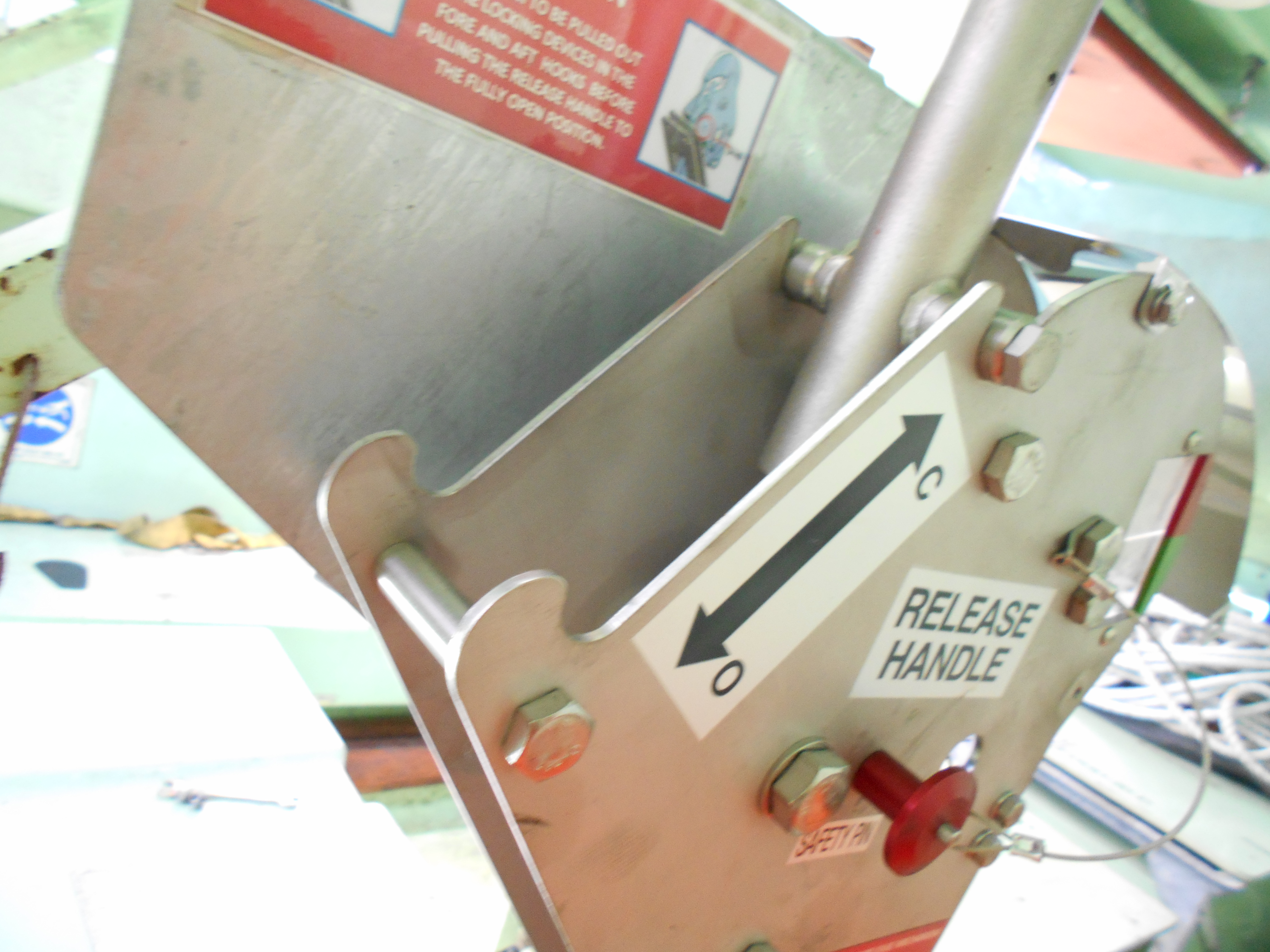 3) 구명정 이탈 레버를 들어서 후크를 개방.
