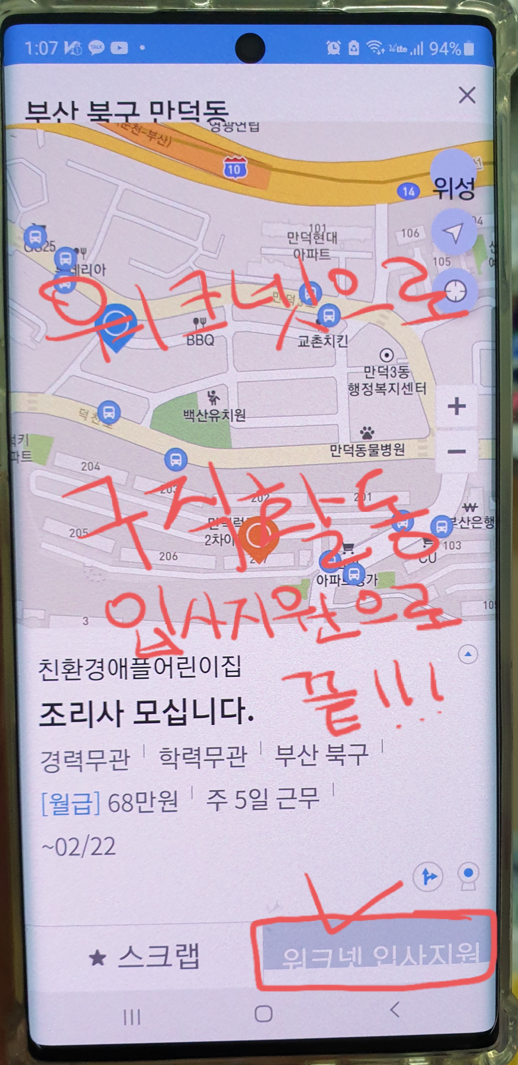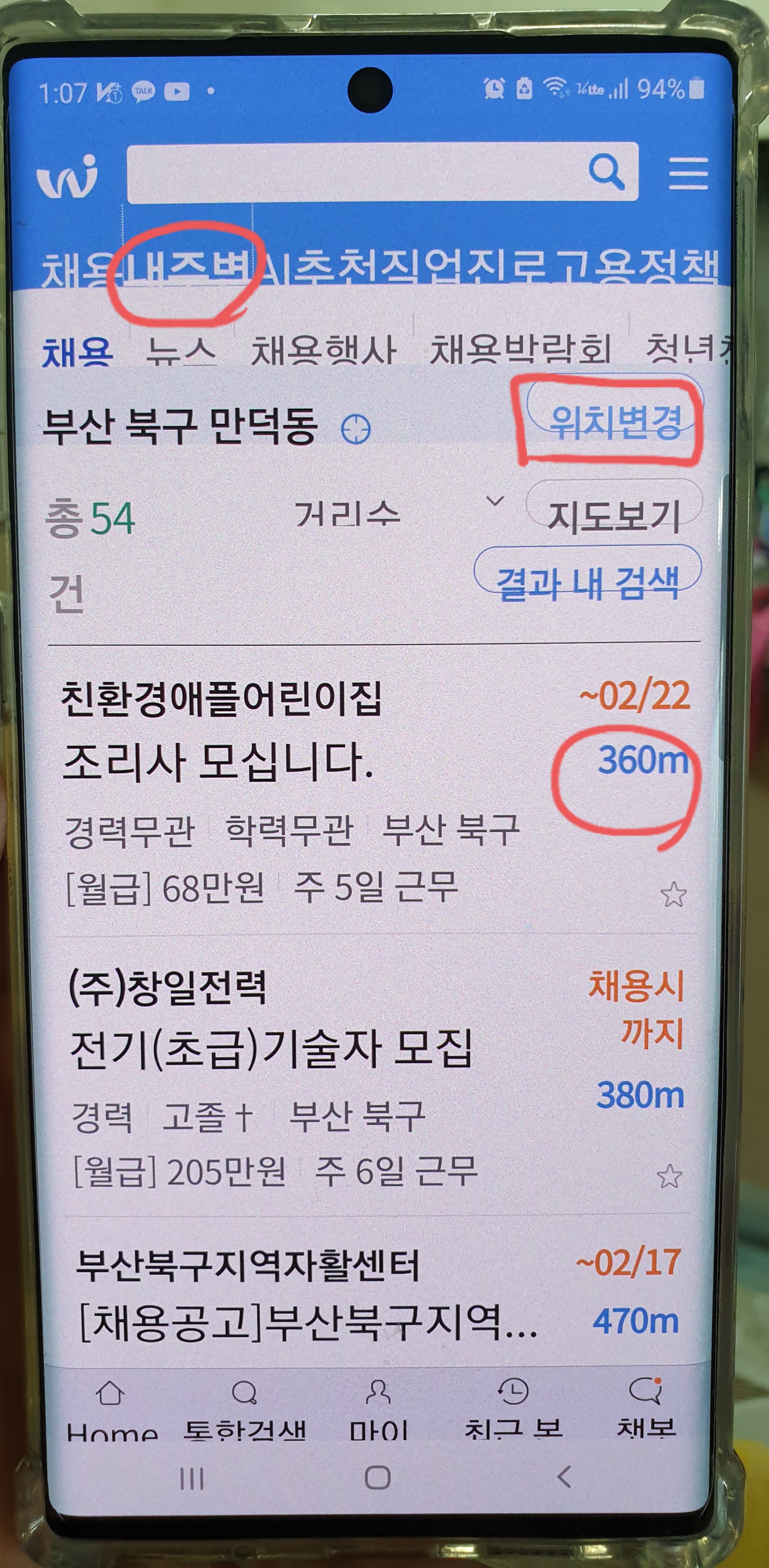 내주변을 눌러서 가깝고 마음에드는 구인란을 클릭한다.