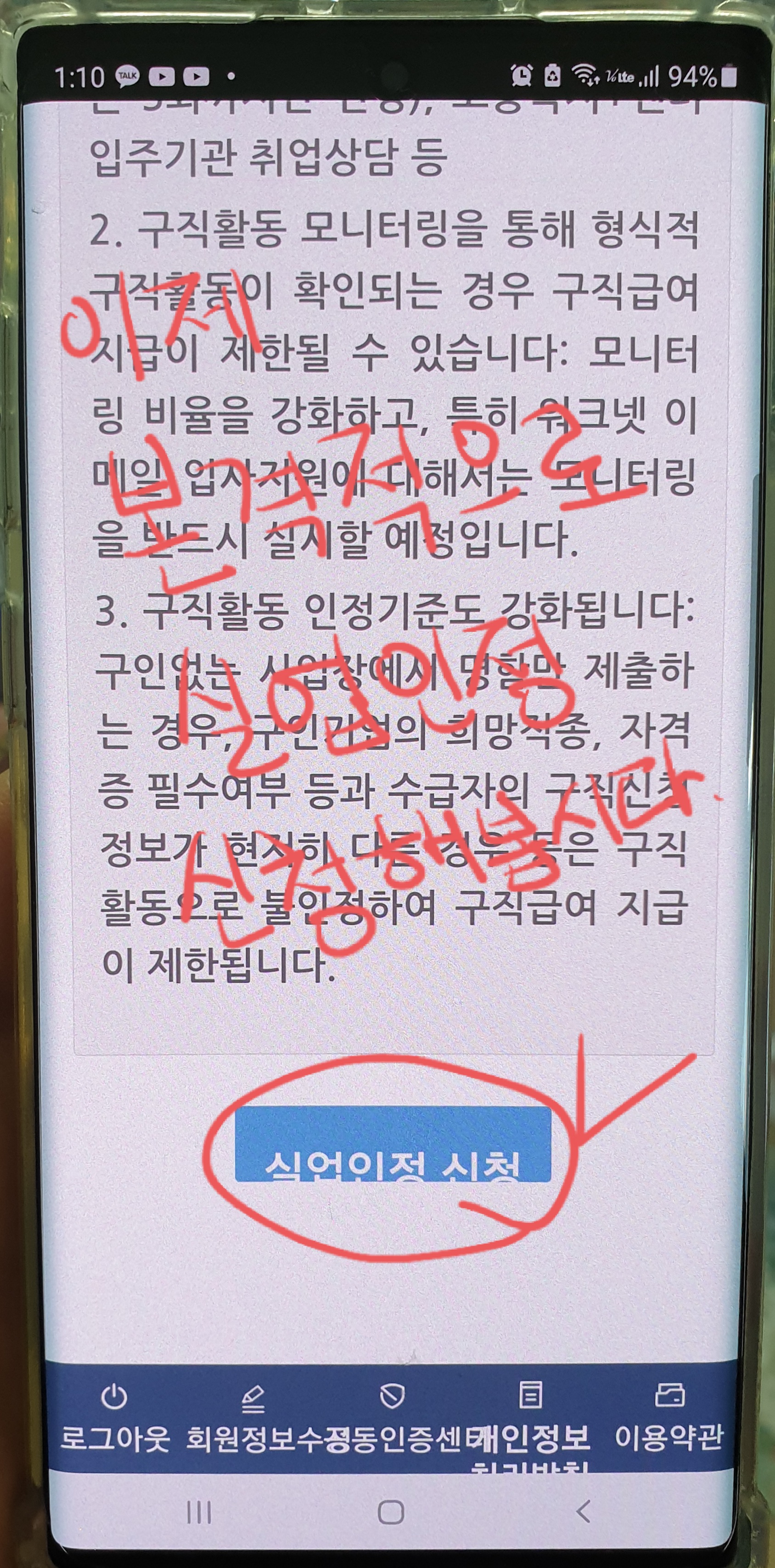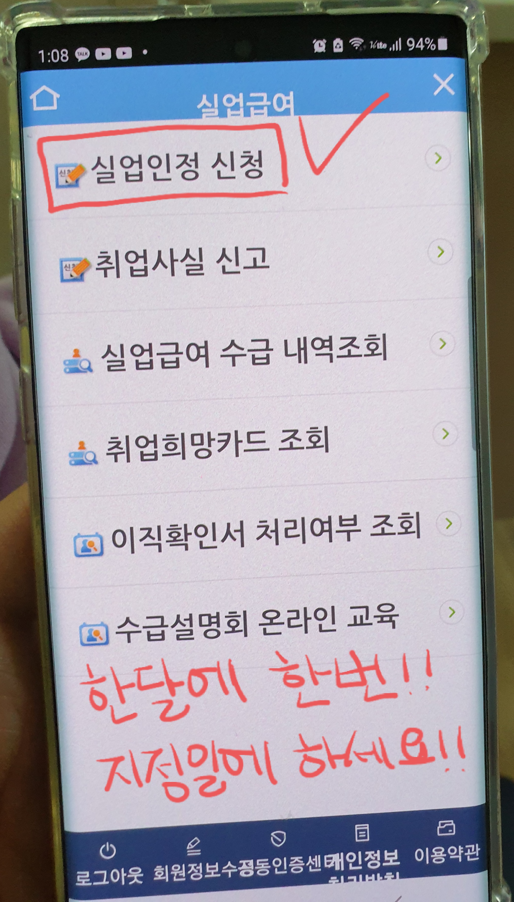 아래 순서대로 핸드폰으로 따라 하기만 하면~ 실업인정 신청이 완료되고, 실업급여를 쉽게 받을수 있다!!!