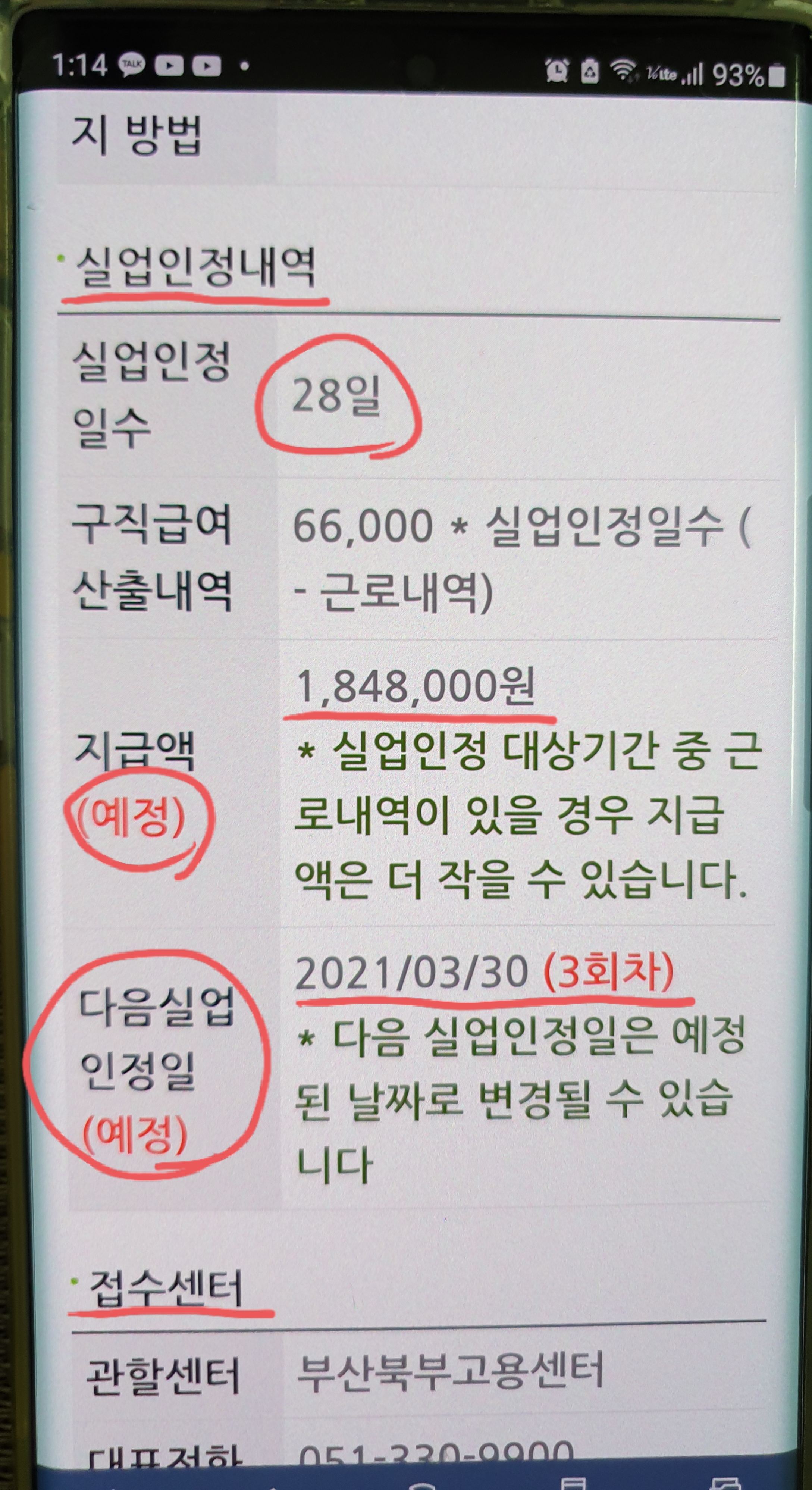 실업인정 일수와 예상금액 , 다음 실업인정일, 접수센터, 연락처 등의 정보를 볼수있어요.
