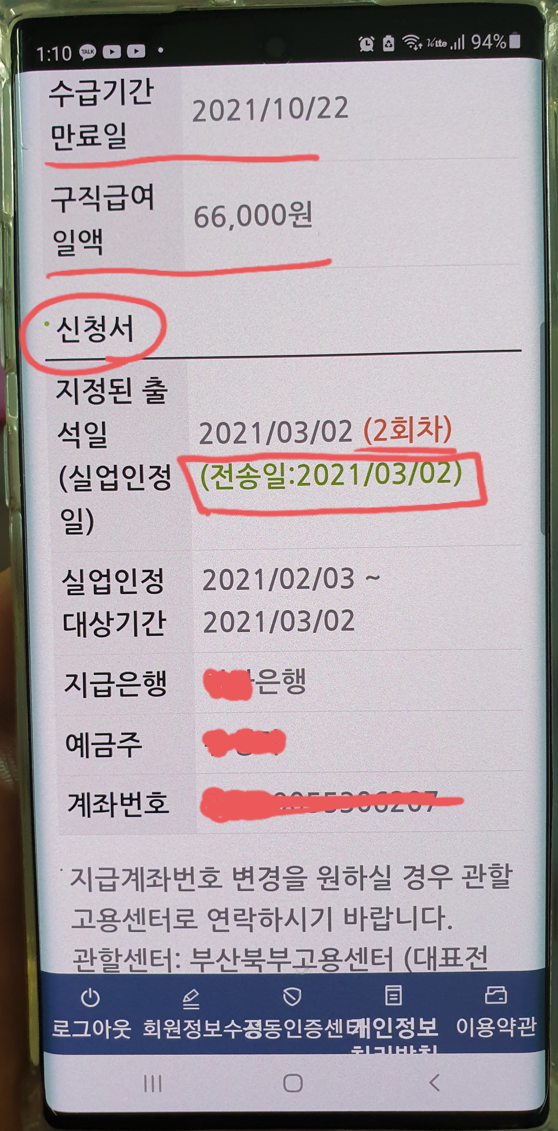 계좌정보는 최초 고용복지센터에 실업인정 신청을 하러갔을때 정보를 적었을 것이다.