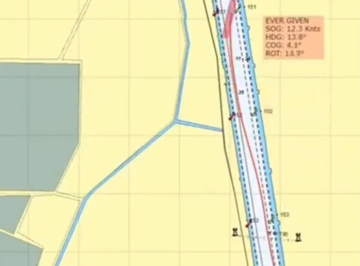 EVER GIVEN호의 AIS TRACKING 영상을 보면 수에즈 운하를 지나면서 강풍을 조우하였고, 초대형 컨테이너선의 거대한 풍상측면을 강타하여 보침성이 결여되어 운하 측면으로 밀렸고, 그 밀림에 대한 대응을 위한 조타로 인해 발생된 사고라고 추정된다. 수에즈운하 파일럿의 휴먼 에러일 가능성도 높다.