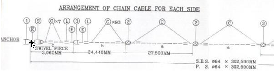 (1) 선외에 신출한 CHAIN CABLE의 길이를 알아보기 쉽도록 ANCHOR 쪽으로 순차로 각 SHACKLE마다 MARKING을 함.