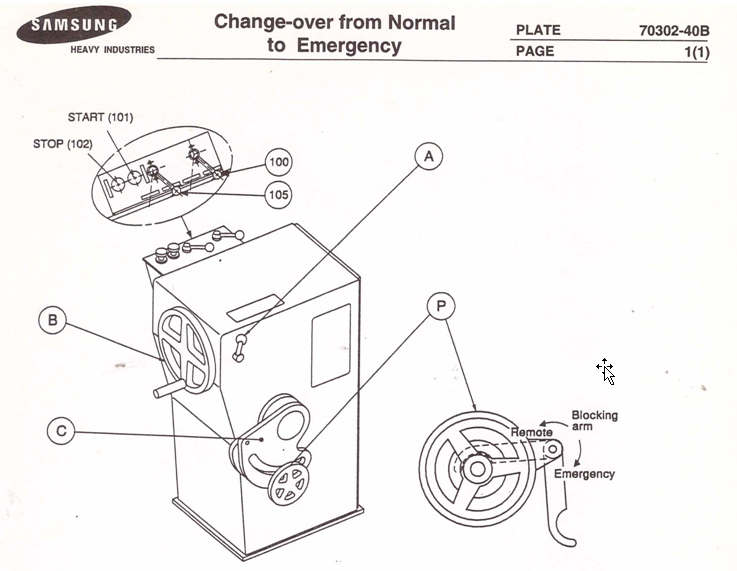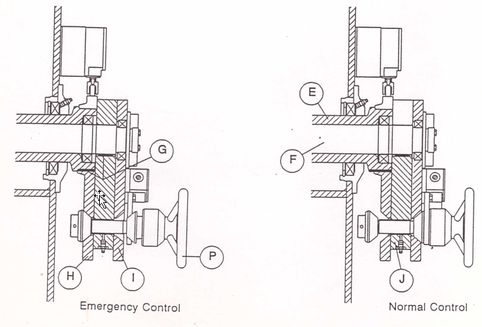 6) GOVERNOR와 F.O PUMP의 연결을 차단하고 EM’CY CONSOLE상의 REGULATING HANDLE과 F.O PUMP를 연결시키기 위해 IMPACT HAND WHEEL(P)를 EM’CY 위치로 신속하게 절환한다.