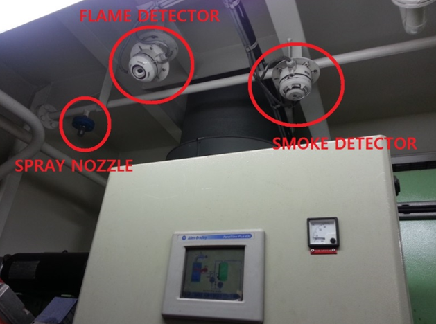 E/R 각각의 주요 화재 발생 가능성이 높은 기기(Main engine, Generator, Compressor, Boiler, Incinerator, Purifier)의 상부에 FLAME DETECTOR와 SMOKE DETECTOR가 부착되어 있다. 이 두 개의 DETECTOR 중 하나의 DETECTOR만이 작동할 경우 물은 분무가 안되고 PRE-WARNING ALARM만 발생하게 되며 ALARM RESET을 시켜주기 전까지 지속적으로 울리게 된다.