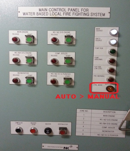 먼저 F.C.S에 설치되어 있는 MAIN CONTOL PANEL FOR WATER BASED LOCAL FIRE FIGHTING SYSTEM으로 이동하여 S/W BOARD에 있는 CTRL. MODE(주황색)를 MANUAL로 설정을 바꾼다. 그 다음 분무시키고자 하는 기기에 해당하는 START 버튼을 누른다.