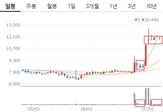- 일봉상 횡보구간 8000원 대비 50% 급등한 상태이다.