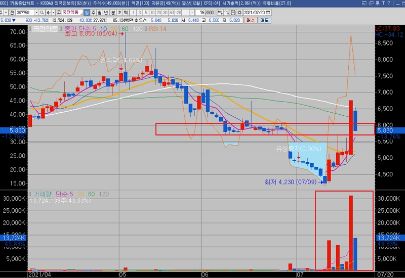 - 솔직히 국전약품 같이 코로나 치료제라는 큰 테마로 움직이는 종목은 차트 분석이 필요 없고, 저가라고 생각될 때마다 매집하는 게 결국 수익을 내는 방법이다.