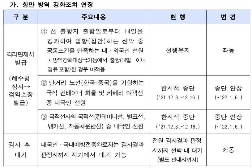 위의 표와 같이, 항만방역강화 조치의 일환으로 선종별 국적별로 차등 적용되던 자가격리 면제의 혜택이 2022년 1월 6일까지 연장되어, 모든 해외 입국자(선원)은 자가격리 10일을 의무적으로 시행하여야 한다.