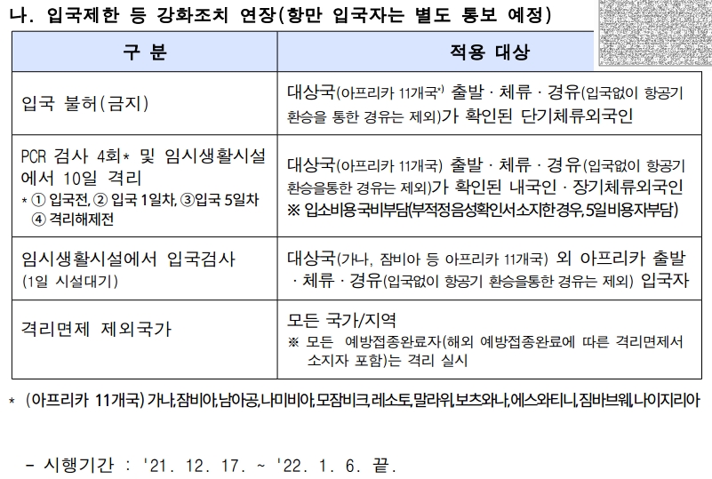 아프리카 11개국 으로부터의 단기체류 외국인의 입국은 전면 금지되고, 내국인과 장기체류외국인은 PCR검사 4회와 10일간의 격리가 적용된다.